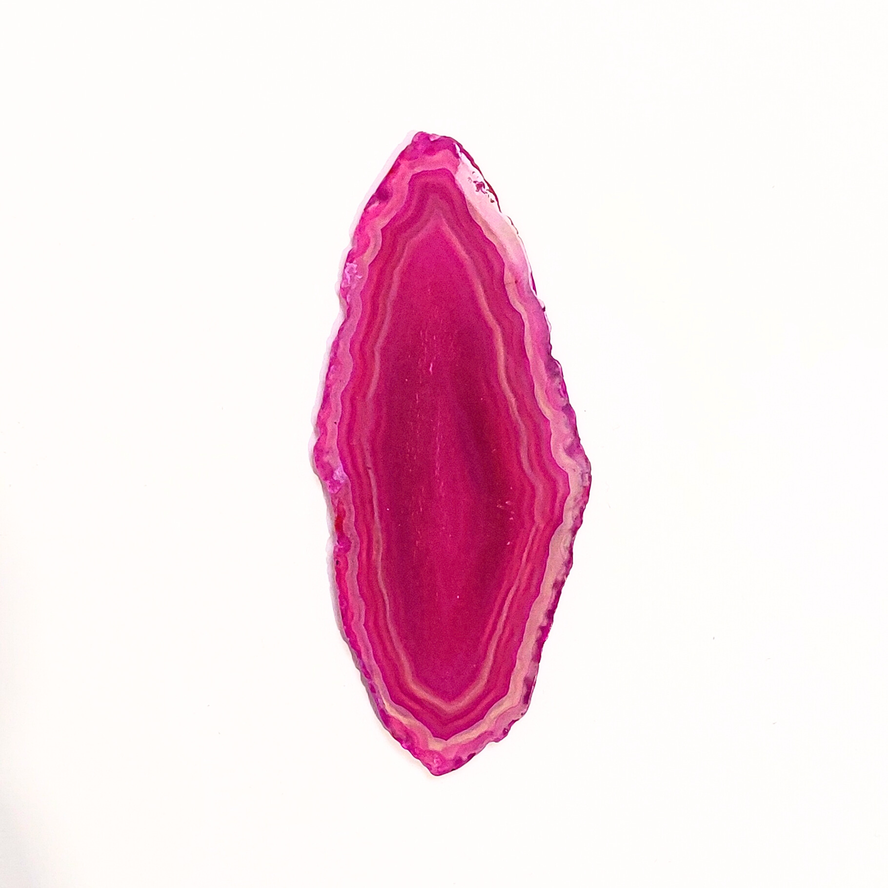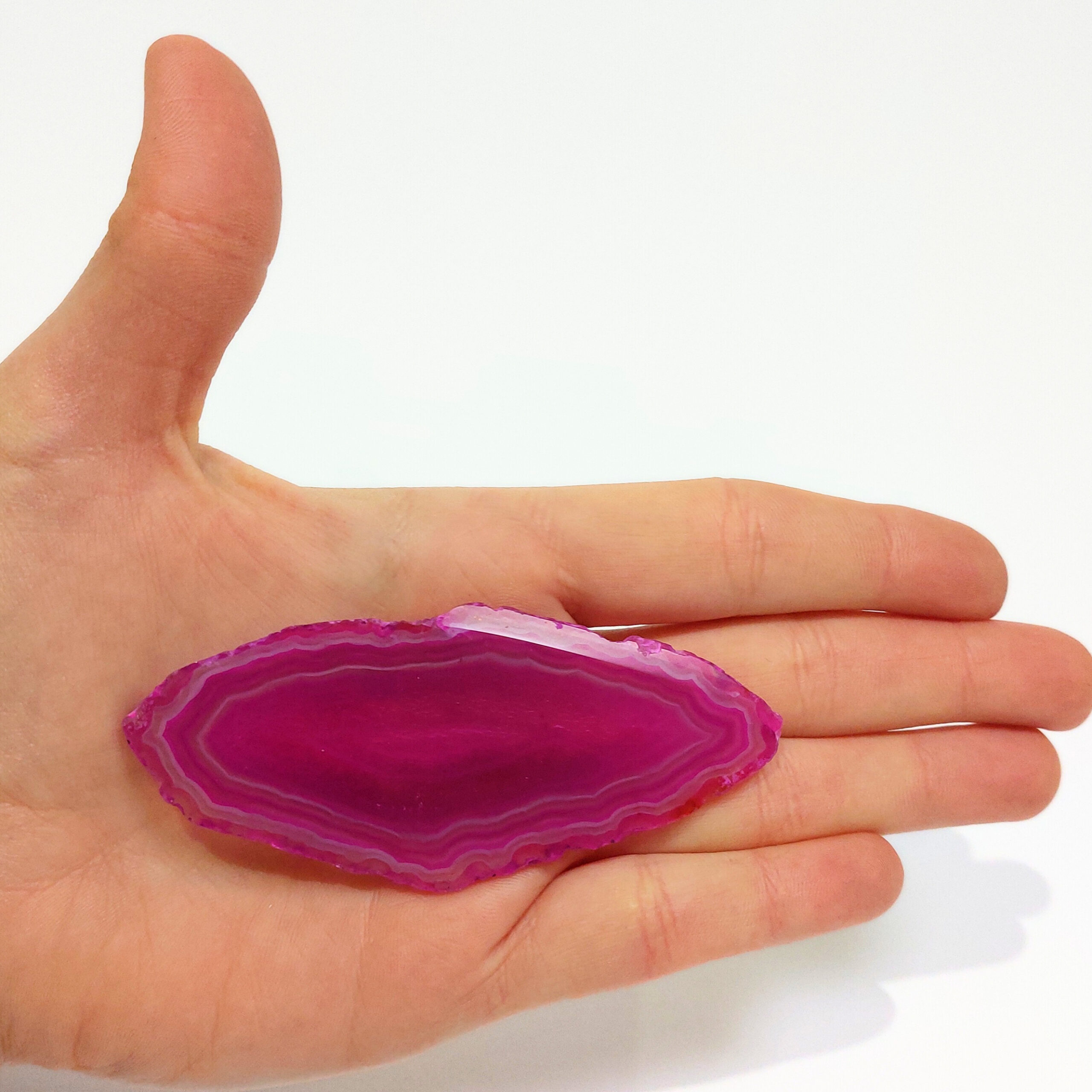 Az ACHÁT egy vulkanikus képződésű kvarc. Az achát geodából levágott szeletet nevezzük achát lapnak. Rengeteg változata van, de gyakran színezik, így például a pink, kék, zöld, lila színek általában nem az eredeti színük, de az ásvány kristályosodása, mintája így látványosabbá válhat. Ha megnézzük fény felé fordítva, akkor különösen szép.