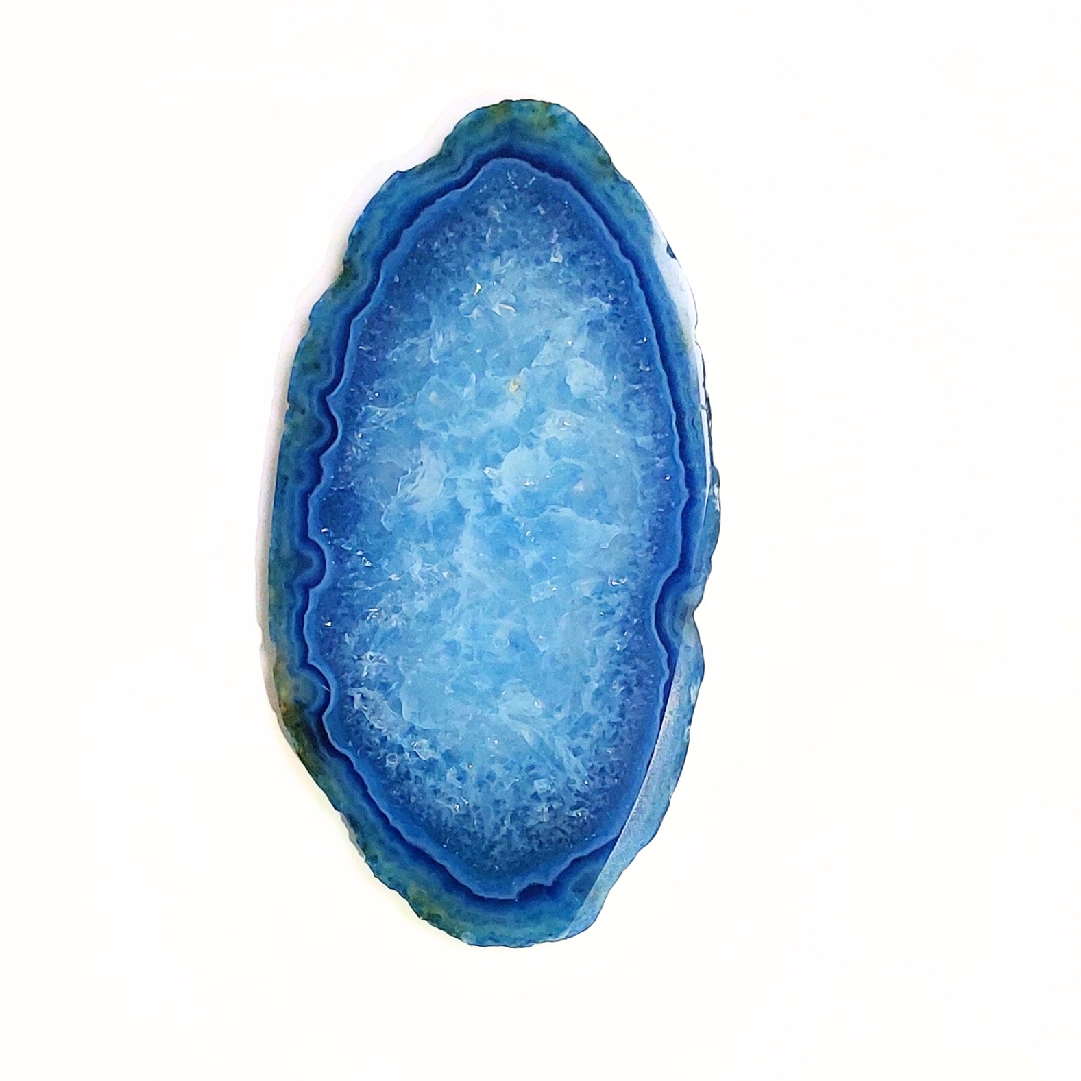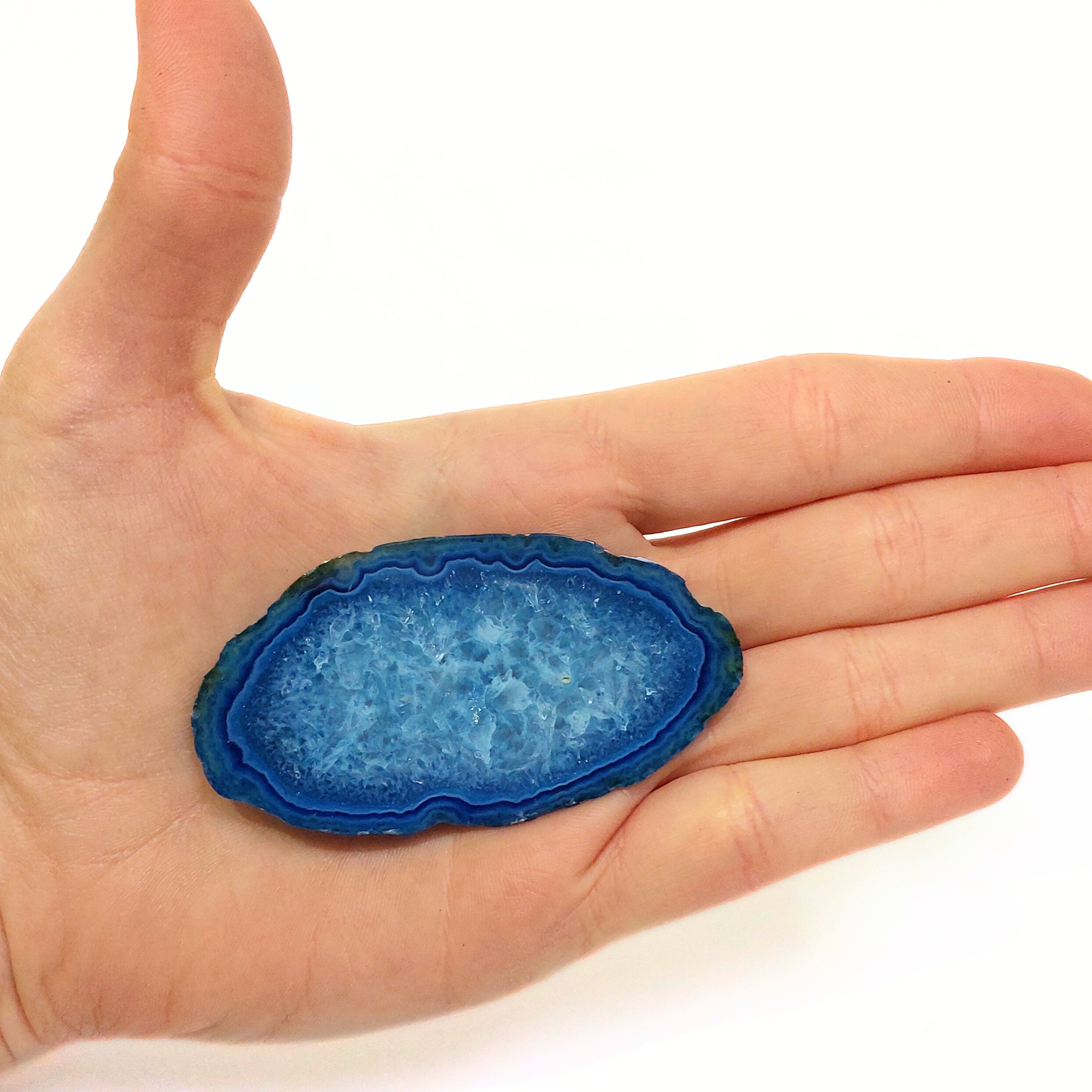 Az ACHÁT egy vulkanikus képződésű kvarc. Az achát geodából levágott szeletet nevezzük achát lapnak. Rengeteg változata van, de gyakran színezik, így például a pink, kék, zöld, lila színek általában nem az eredeti színük, de az ásvány kristályosodása, mintája így látványosabbá válhat. Ha megnézzük fény felé fordítva, akkor különösen szép.