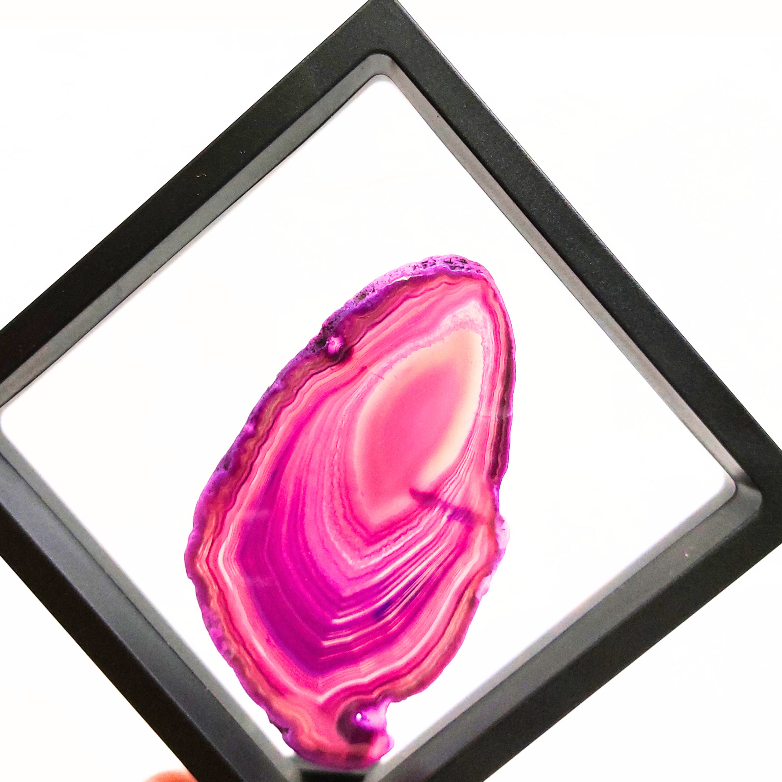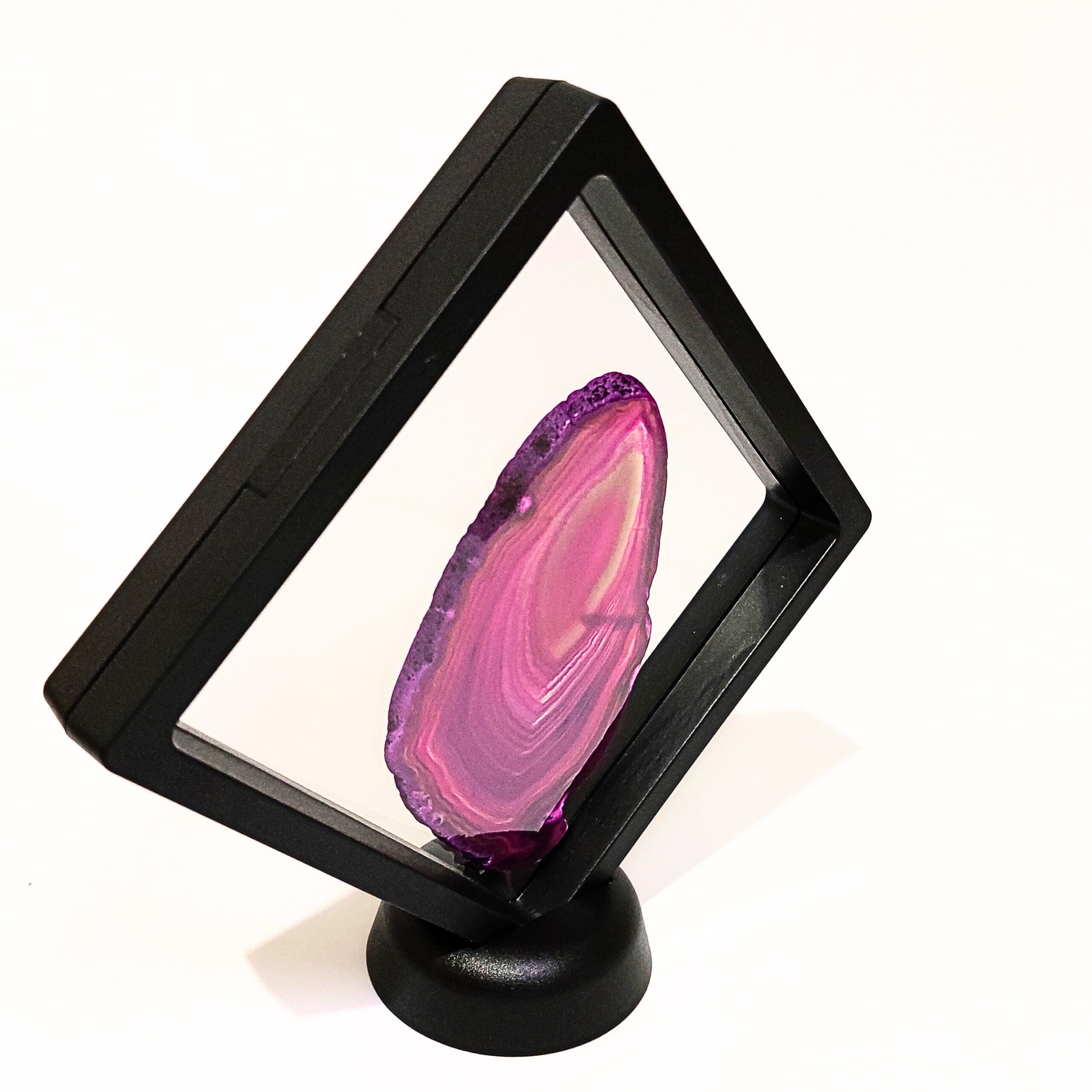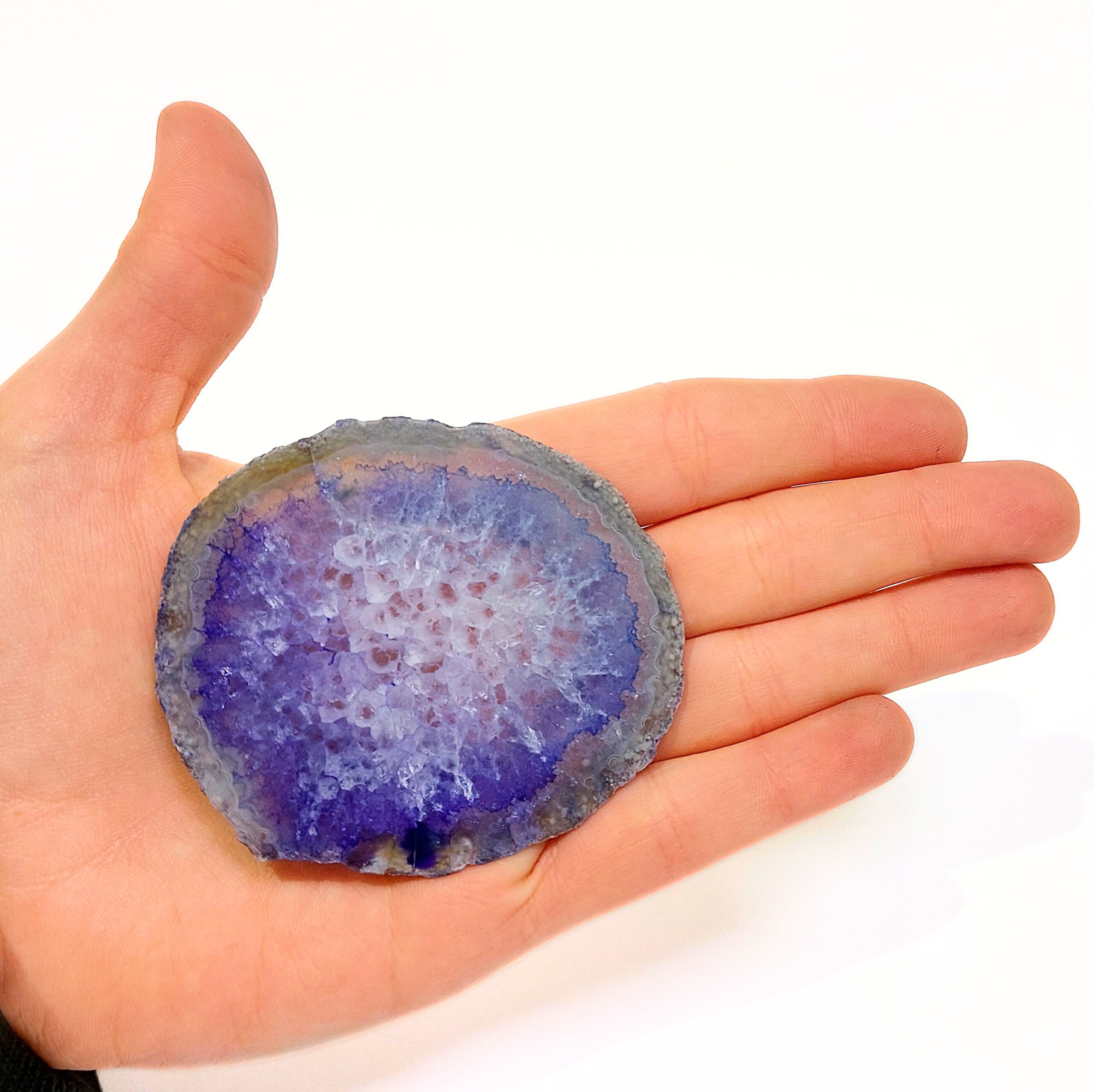 Az ACHÁT egy vulkanikus képződésű kvarc. Az achát geodából levágott szeletet nevezzük achát lapnak. Rengeteg változata van, de gyakran színezik, így például a pink, kék, zöld, lila színek általában nem az eredeti színük, de az ásvány kristályosodása, mintája így látványosabbá válhat. Ha megnézzük fény felé fordítva, akkor különösen szép.