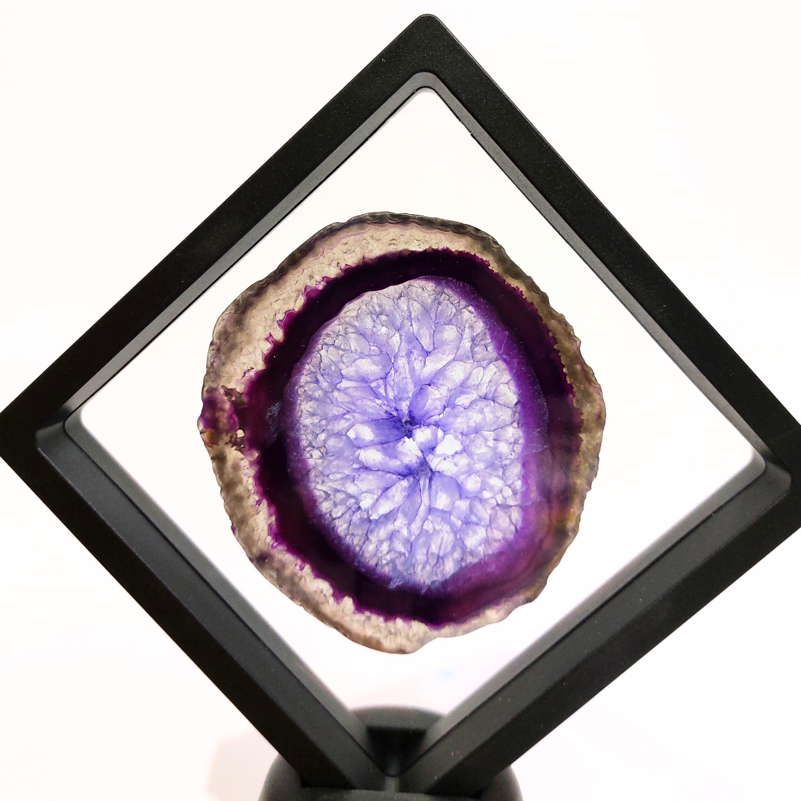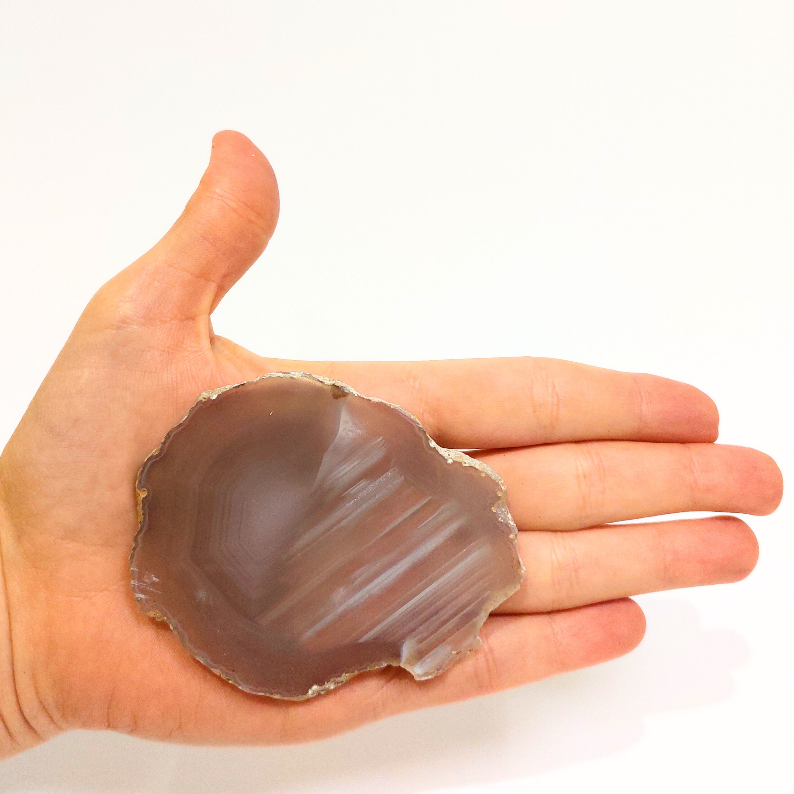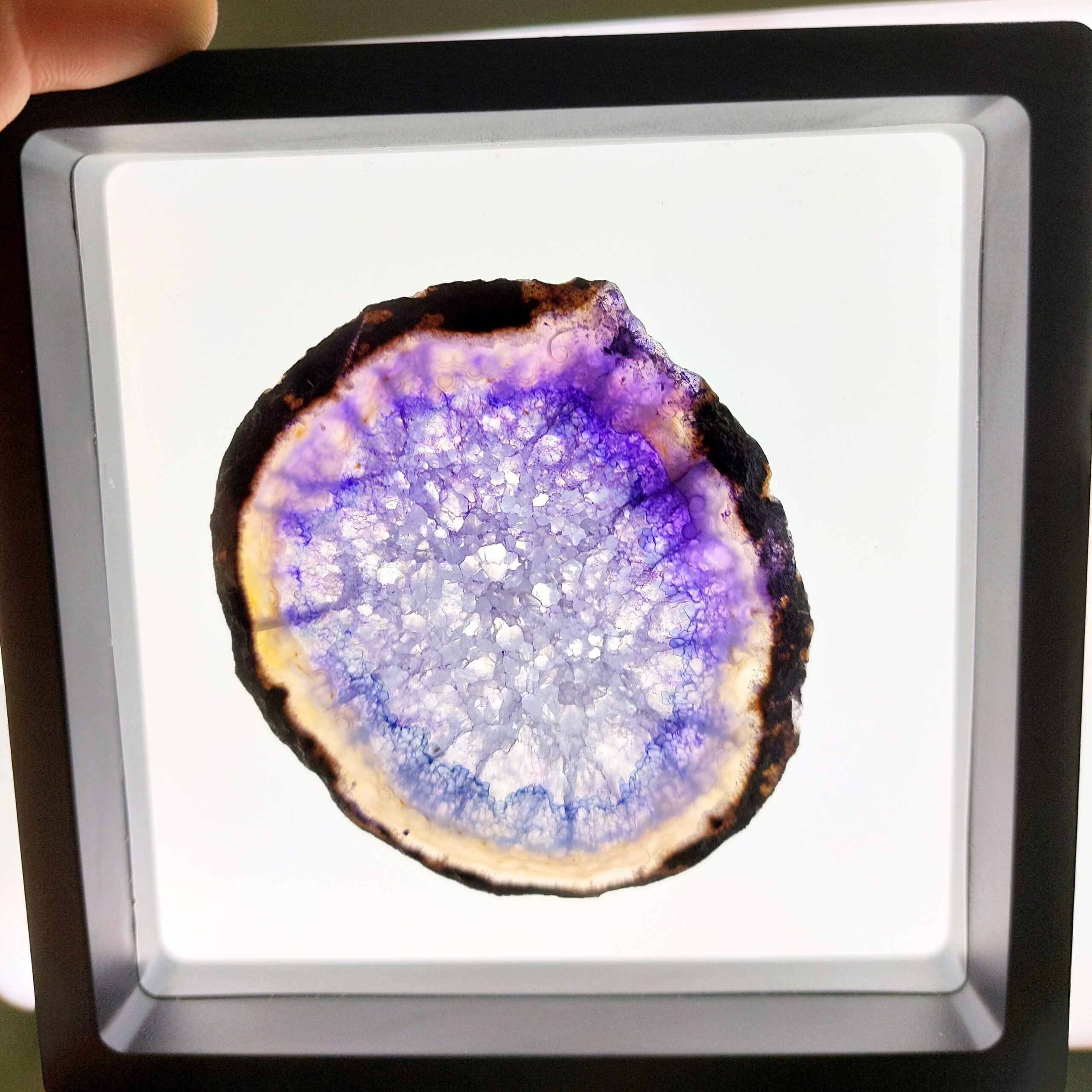 Az ACHÁT egy vulkanikus képződésű kvarc. Az achát geodából levágott szeletet nevezzük achát lapnak. Rengeteg változata van, de gyakran színezik, így például a pink, kék, zöld, lila színek általában nem az eredeti színük, de az ásvány kristályosodása, mintája így látványosabbá válhat. Ha megnézzük fény felé fordítva, akkor különösen szép.