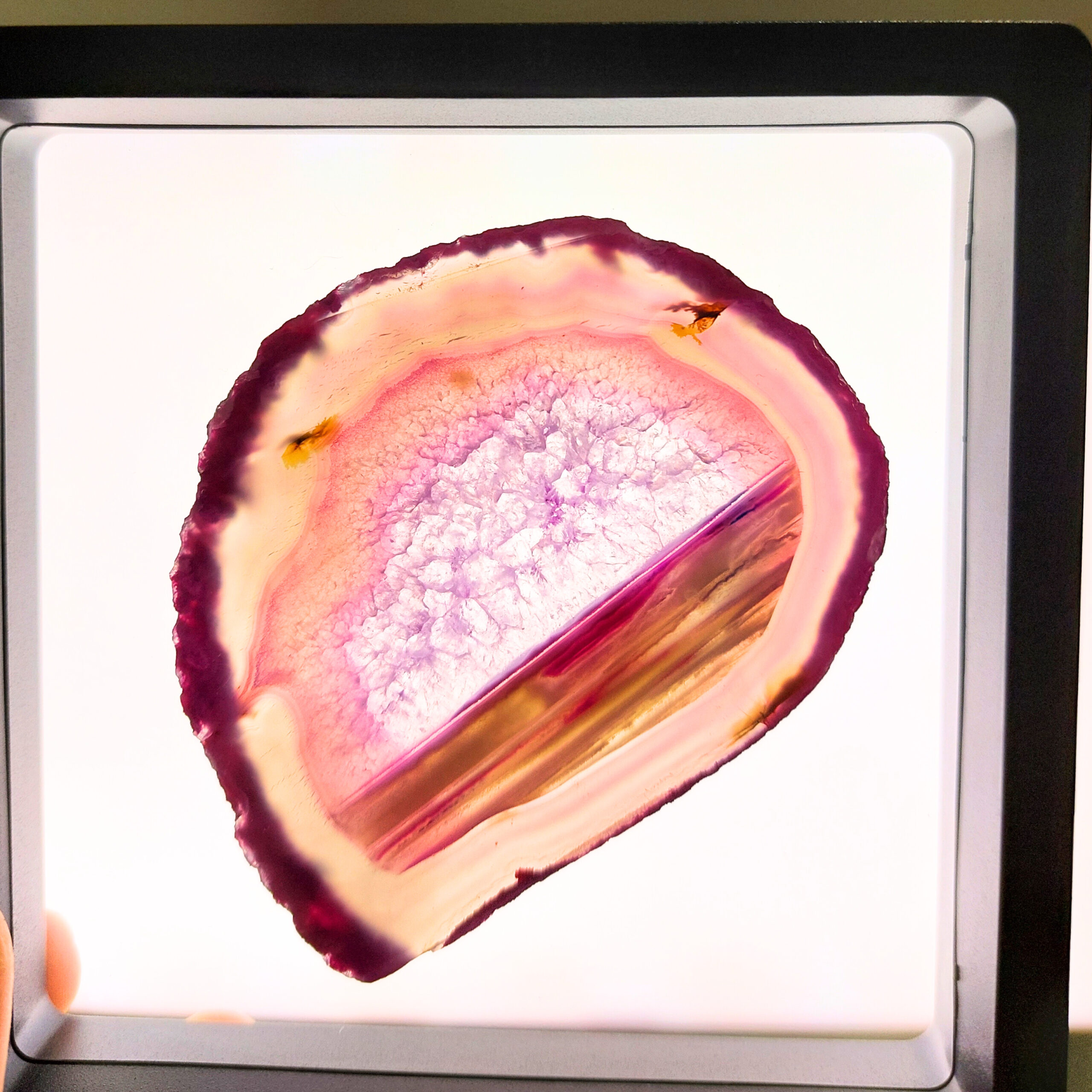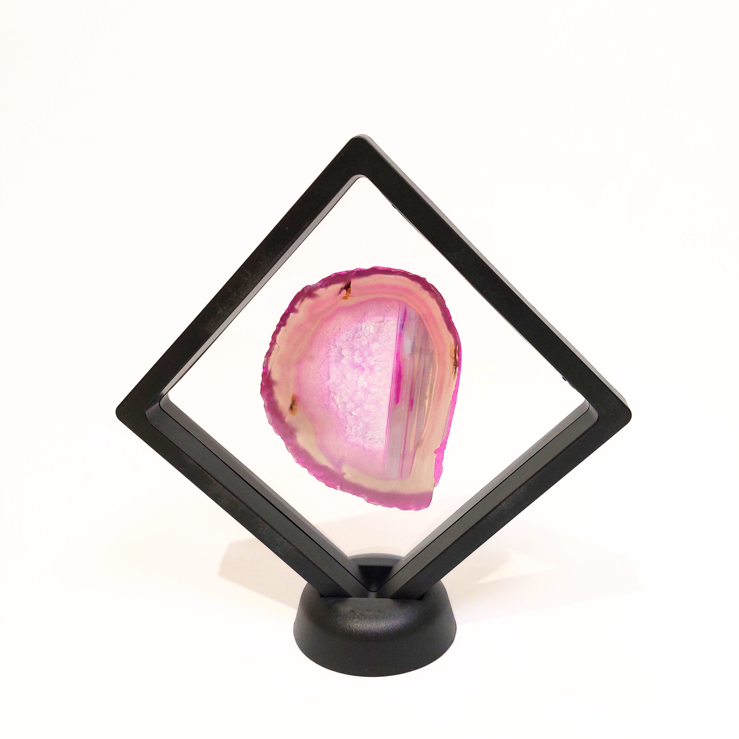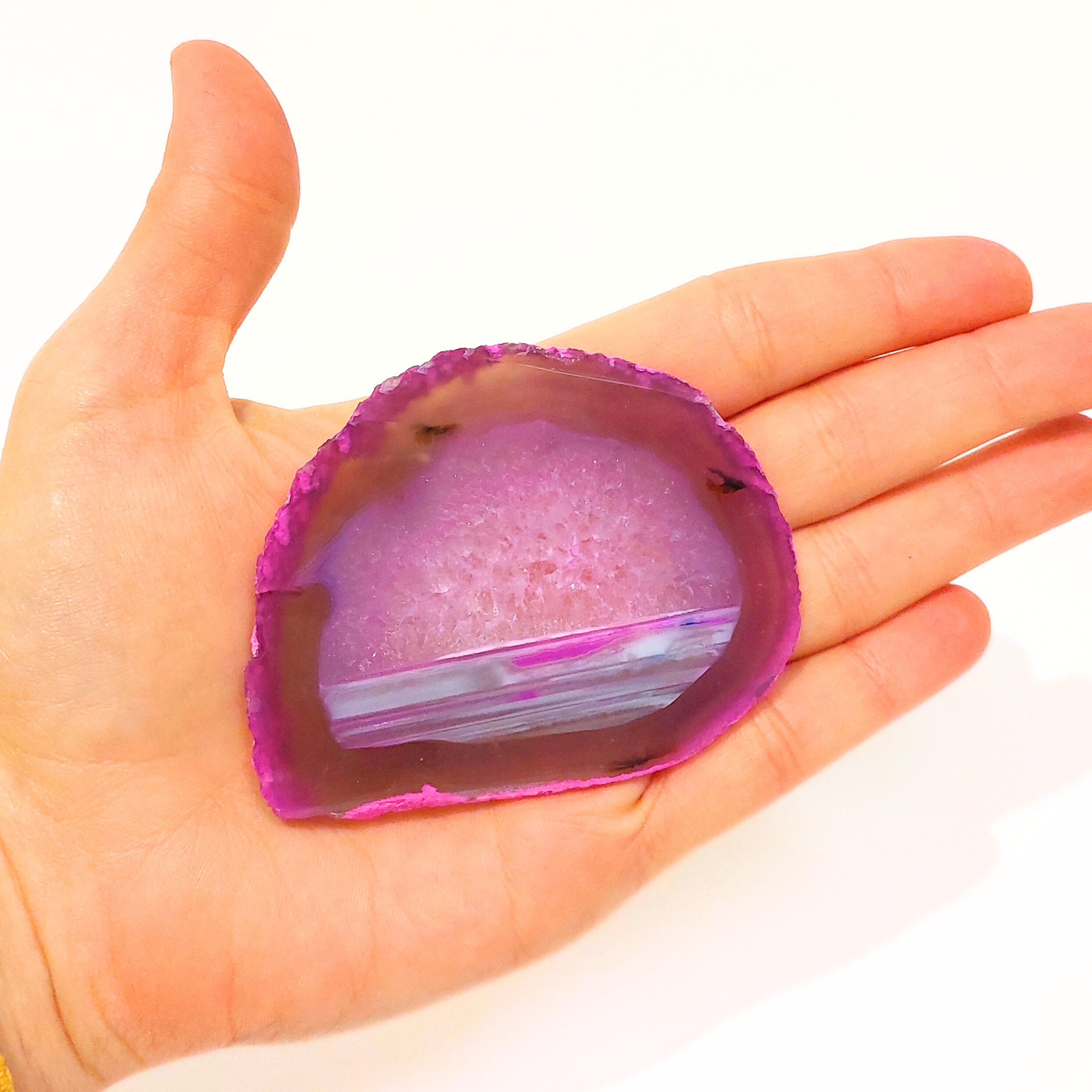 Az ACHÁT egy vulkanikus képződésű kvarc. Az achát geodából levágott szeletet nevezzük achát lapnak. Rengeteg változata van, de gyakran színezik, így például a pink, kék, zöld, lila színek általában nem az eredeti színük, de az ásvány kristályosodása, mintája így látványosabbá válhat. Ha megnézzük fény felé fordítva, akkor különösen szép.