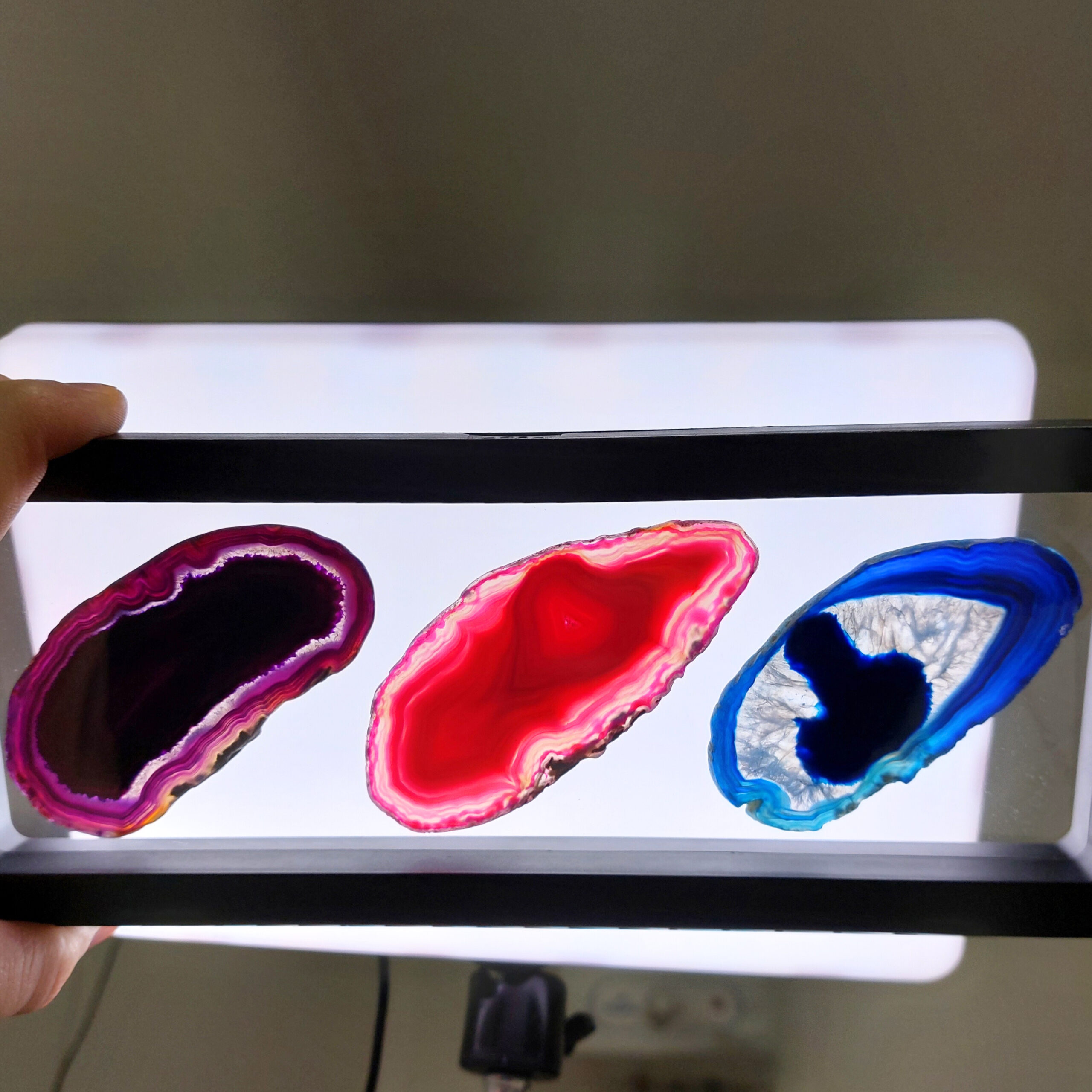 Az ACHÁT egy vulkanikus képződésű kvarc. Az achát geodából levágott szeletet nevezzük achát lapnak. Rengeteg változata van, de gyakran színezik, így például a pink, kék, zöld, lila színek általában nem az eredeti színük, de az ásvány kristályosodása, mintája így látványosabbá válhat. Ha megnézzük fény felé fordítva, akkor különösen szép.